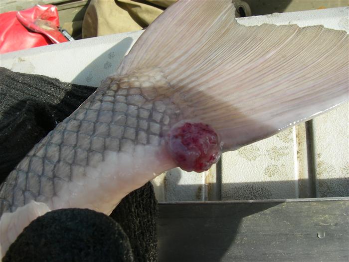 Enlarged cell growth typical of Lymphocystis on a white sucker.