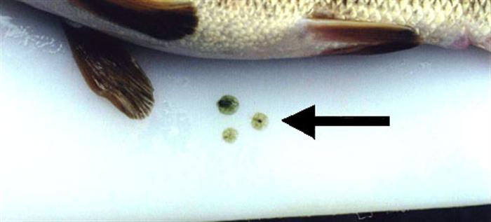 It is common for fish to have lice (see arrow). Fish lice are often found behind the fins.