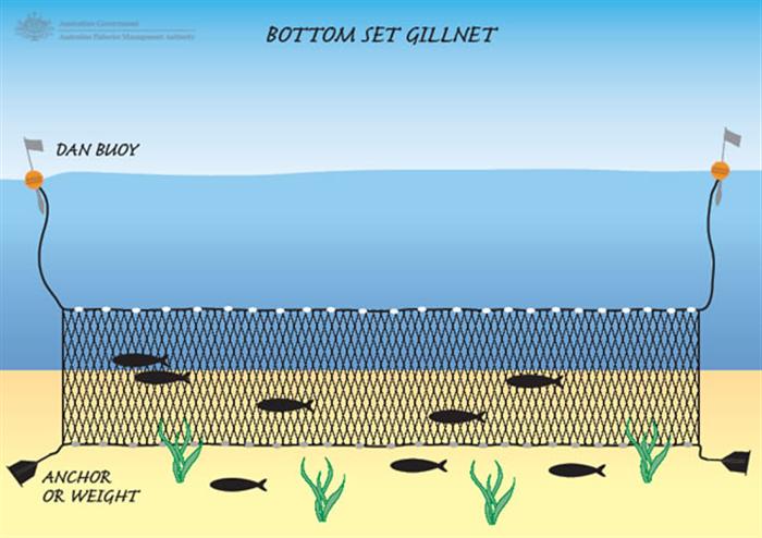 This figure illustrates how a gillnet is used to capture fish.
