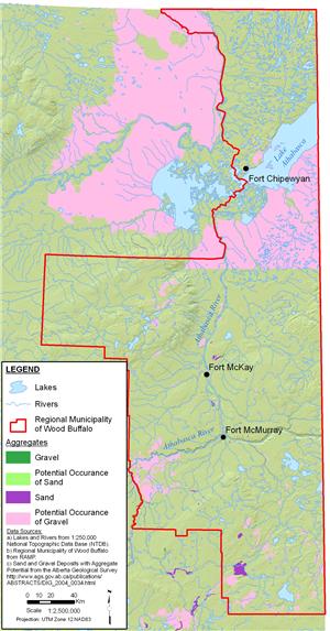 Given northern Alberta's glacial geography, aggregate mining in the region focuses on glacial and fluvial deposits of gravel and sand. Some 99% of the aggregate extracted is sand and gravel, mostly from the Alberta Plains, east of the foothills and front ranges of western Alberta (Edwards 1998a). The aggregate resources of the Fort McMurray region are largely glaciofluvial, with major meltwater-channel deposits adjacent to the Clearwater and Athabasca rivers (Scafe 1988). Sand and gravel deposits are also found on the MacKay River and Stony Mountain (Fox 1980).