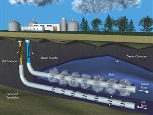 Steam Assisted Gravity Drainage (SAGD) is currently the most commonly used in situ recovery method. This method requires the drilling of two horizontal wells through the oil sands deposit. Heated steam is injected into the upper well, where the build-up of pressure and heat melts the bitumen and causes it to flow downward to the second horizontal well, from which it is pumped to the surface. Water is injected into the deposit to maintain stability after the bitumen is removed.