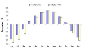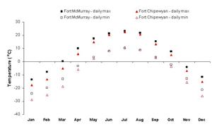 Temperatures in the Wood Buffalo region show strong seasonal variation, as seen in in the graph to the right.