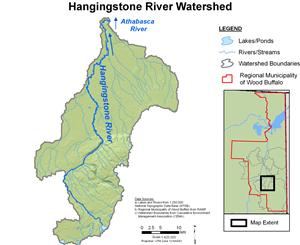The Hangingstone River drains an area of 1,070 km², and flows into the Clearwater River just upstream of the Athabasca River at Fort McMurray. The landscape of the Hangingstone River drainage basin is dominated by muskeg. The headwaters of the river are located an an elevation of approximately 720 m.