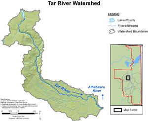 The Tar River collects water from the southeast slopes of the Birch Mountains, with a headwater elevation of approximately 810 m. In its lower reaches, the Tar River historically meandered through a muskeg-dominated landscape until it reaches the Athabasca River from the west at an elevation of approximately 230 m. The drainage area of the Tar River is 333 km². Flows for the Tar River are recorded by RAMP (station S15 and S15A; Tar River near the mouth and station S34; Tar River above the Canadian Natural compensation lake) and were previously recorded by WSC (station 07DA0150).